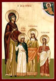 Η Αγία μάρτυς Σοφία καταγόταν από μεγάλη πόλη της Ιταλίας. Ήταν γυναίκα σεμνή και ευσεβής. Έμεινε χήρα πολύ νωρίς. Έτσι αναγκάστηκε να εγκατασταθεί στη Ρώμη με τις τρεις κόρες της, την Πίστη δώδεκα ετών, την Ελπίδα δέκα και την Αγάπη εννέα ετών.